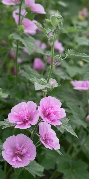This perennial hollyhock produces bubble gum pink flowers that are almost double in late summer, on tall stems with a branching habit. Butterflies and bees love it.