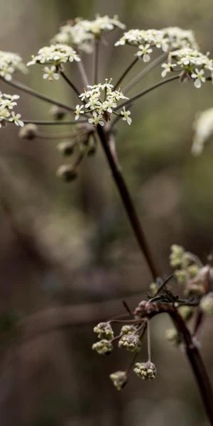 This rather special form of Cow Parsley produces masses of delicate white flowers in umbels held up on striking purple-black branched stems with deeply cut filigree leaves.