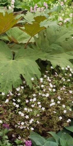 Clusters of small, white, shallow-trumpet flowers are held on branching stems over billowing mounds of deeply cut mid-green foliage. This white form of ‘Herb Robert’ quickly develops into sizeable plants with a slightly relaxed habit.