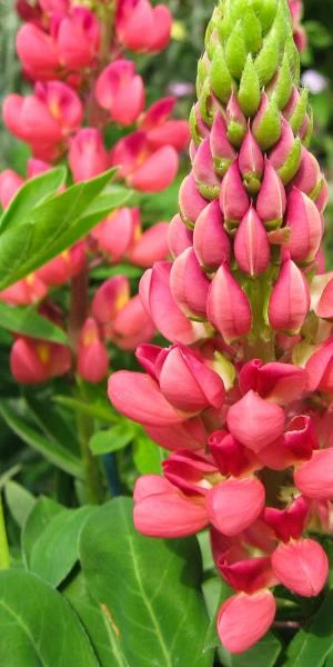 Tall, densely packed spikes of light red flowers with a darker standard appear during summer. The blooms which are heavily fragrant stand above palmate-shaped green foliage.