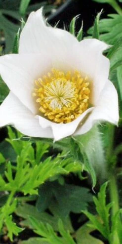 Commonly known as the White Pasqueflower, this spring to early summer flowering perennial has large, pure white, nodding bell-like flower heads which are held above a mound of finely divided, fern-like foliage.Â